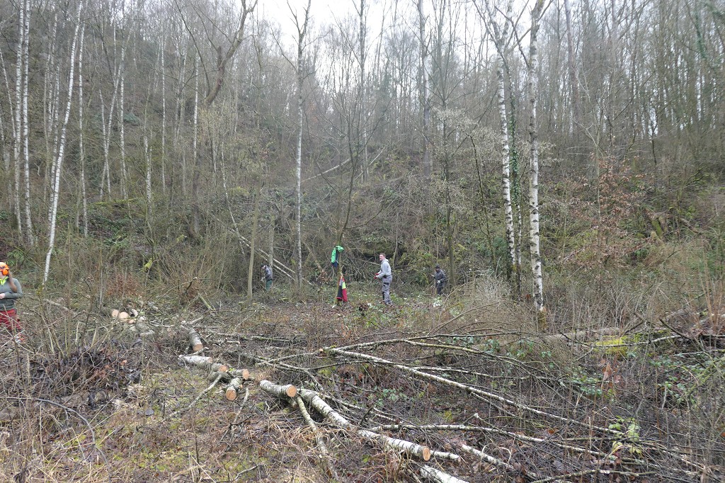 Unser erster Arbeitseinsatz im neuen Jahr fand wegen der winterlichen Bedingungen erst an diesem Samstag statt. Der Einsatzort war die Turmfalkenecke. Sie liegt in Grube 7, linker Hand am Ende der Grube auf der Wanderwegs Ebene (Neanderlandsteig). Diese kleine Magerrasenfläche mit Folienteich ist ein besonders schönes Gelände. Im Sommer verwandelt sich die Wiese, umgeben von hohen und steilen Felswänden, in eine bunte Wildblumenlandschaft. Für Wanderer ist das ein echter Blickfang.
